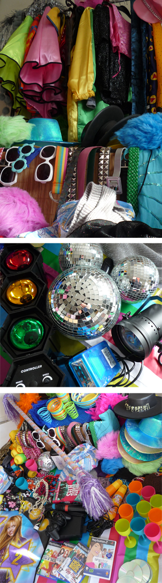 Verkleedkleding, aankleding in huis, servies en attributen voor spellen.
